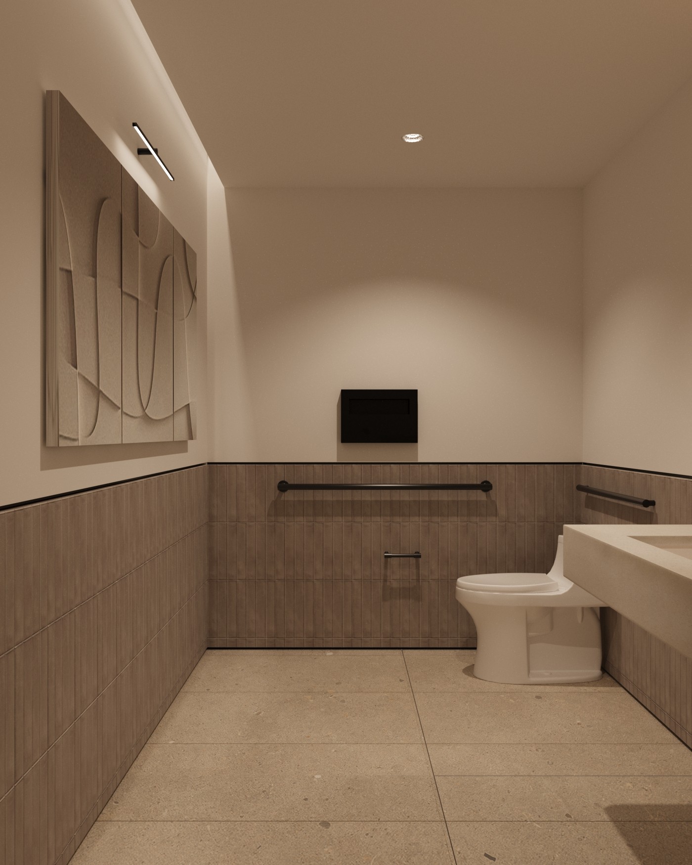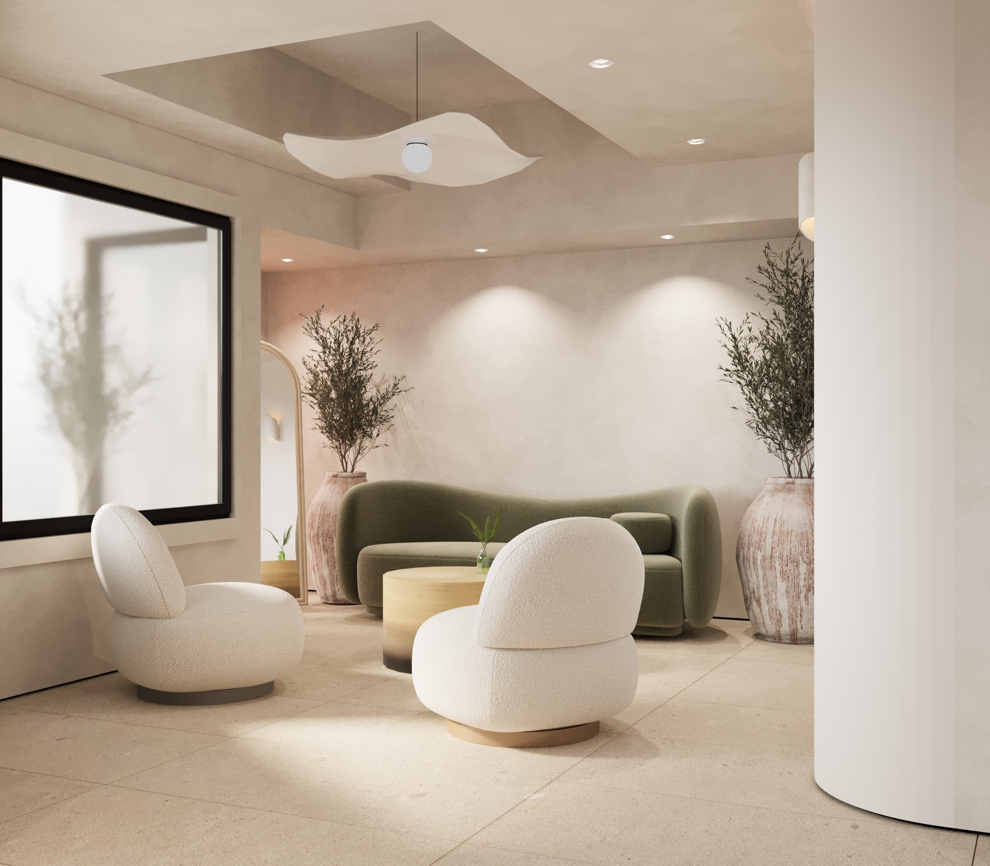 The interior is designed to promote calm and restoration through soft materiality, warm light, and a restrained, neutral palette. Sand-toned limestone wall finishes create a quiet, tactile backdrop, while gentle curves and arched openings shape a fluid, welcoming spatial experience.